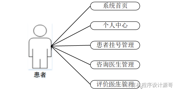 患者登录使用本系统涉到的功能主要有个人中心、患者挂号管理、咨询医生管理、评价医生管理等功能。患者用例如图3-3所示。