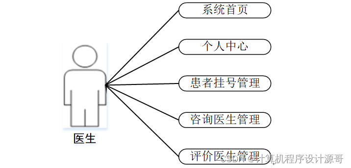 医生登录使用本系统涉到的功能主要有个人中心、患者挂号管理、咨询医生管理、评价医生管理等功能。医生用例如图3-2所示。