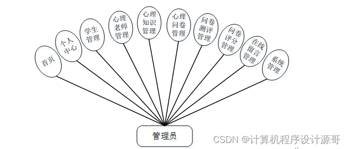 管理员端的功能主要是开放给系统的管理人员使用,主要包括对首页、个人中心、学生管理、心理老师管理、心理知识管理、心理问卷管理、问卷测评管理、问卷评分管理、在线留言管理、系统管理进行查看,修改和删除等,对系统整体运行情况进行了解。管理员用例分析图,如图3-1所示。