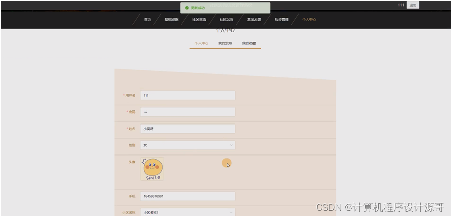 点击个人中心,用户可以修改个人信息和登录密码,个人信息包括:用户账号、用户姓名、性别、年龄、头像、用户手机等,个人中心页面如图5-7所示: