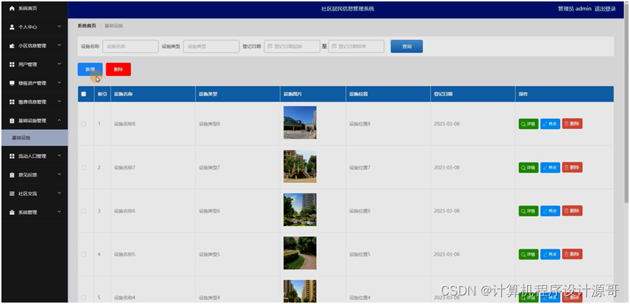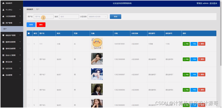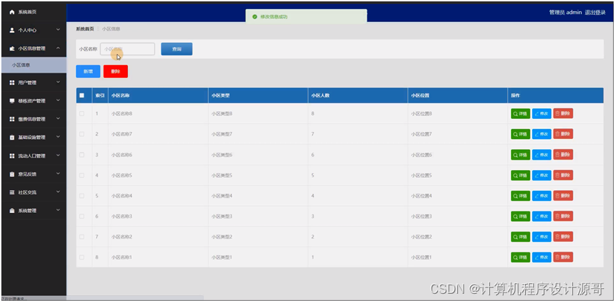 管理员点击小区信息管理,进入小区信息管理页面,通过输入小区名称可以查询相关信息,并进行新增、修改或删除操作。具体操作如图5-12所示: