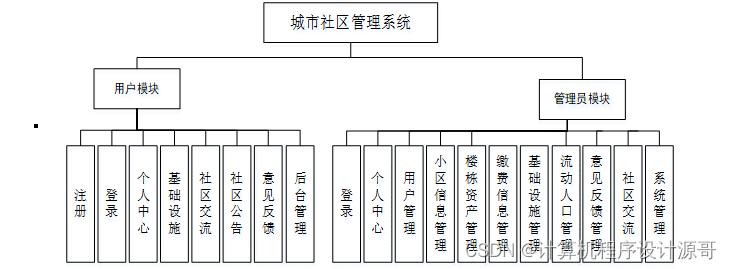 管理员模块属于是网站的后台,进入之后有大量的管理员功能,管理员也可以使用用户模块功能,为了维护网站的稳定与页面的布局,将管理员模块的功能详细化后可以使用系统管理对页面进行布局修改,可以发布公告提示用户规范,用户模块只可以对个人信息、登录密码、基础设施、社区交流、社区公告、意见反馈等进行管理等,社区居民信息管理系统总体结构图如下图所示。