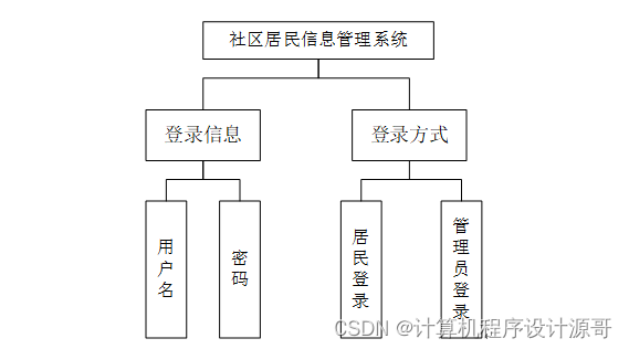系统启动后,在登录界面,输入正确的账号密码,选择进入管理员界面或用户界面,管理员界面是用来管理页面与用户信息,用户界面可以正常的使用,并对个人信息、基础设施、社区交流、社区公告、意见反馈等进行份内的操作,系统登录结构图如图4-1所示。