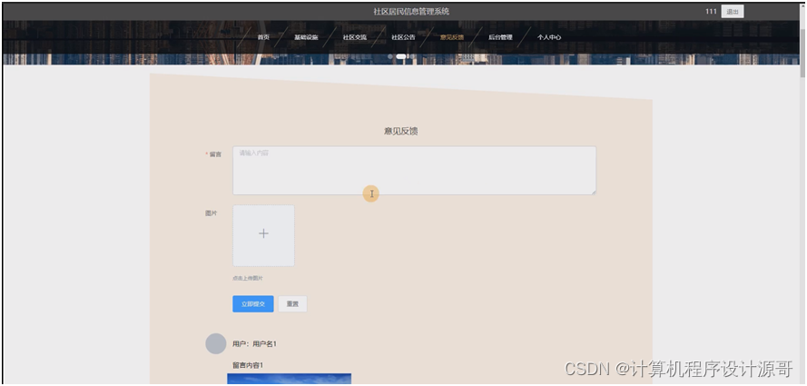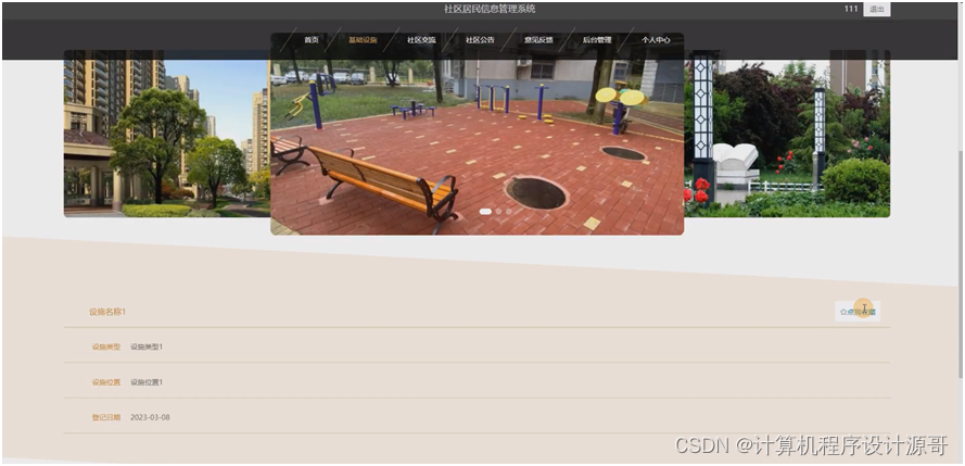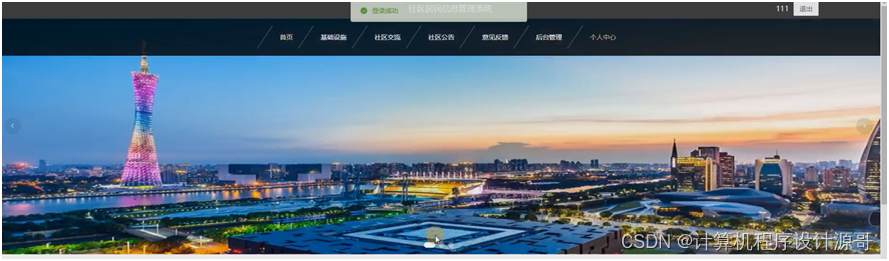 用户注册成功后,通过输入正确的账号、密码,选择登录角色,即可登录到系统进行相关操作,包括基础设施、社区交流、社区公告、意见反馈、后台管理、个人中心。系统首页界面如图5-2所示: