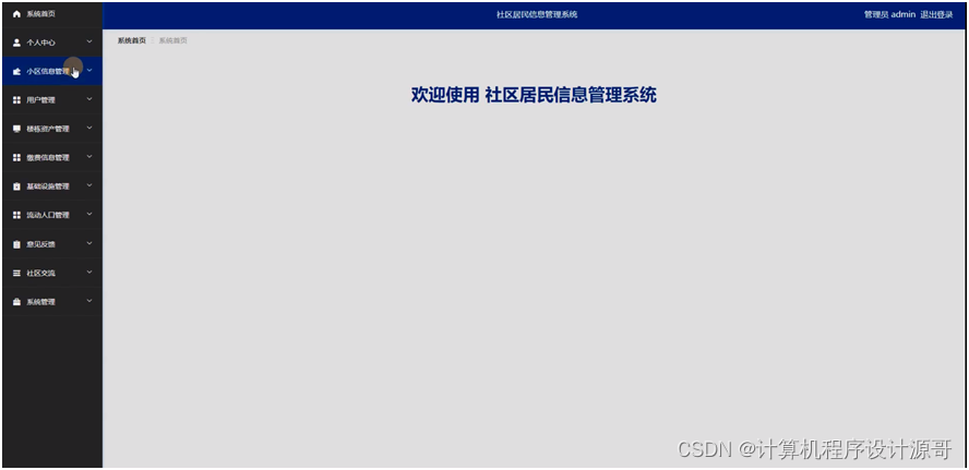 管理员进入主页面,主要功能包括对个人中心、小区信息管理、用户管理、楼栋资产管理、缴费信息管理、基础设施管理、流动人口管理、意见反馈管理、社区交流、系统管理等进行操作。管理员主页面如图5-10所示: