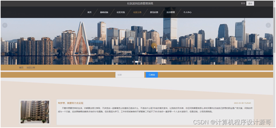 点击社区公告,进入社区公告页面,用户可以输入标题可以进行查询操作,进入查看社区公告信息。操作页面如下图所示: