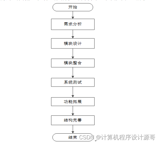 系统的开发流程设计简单的介绍了开发过程,先对任务书进行分析,根据要实现的功能对各个模块进行开发,之后再对模块一一进行测试,测试成功后将模块整合再测试整体功能,完善整体结构[6]。开发系统流程图如图4-3所示。