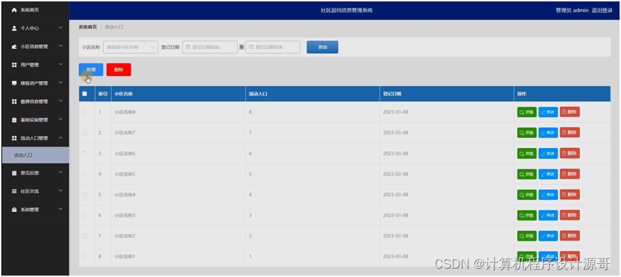 管理员点击流动人口管理,进入流动人口管理页面,通过输入小区名称、登记日期可以查询相关信息,并对流动人口信息进行修改、删除的操作;管理员还可以根据权限新增流动人口信息,如图5-16所示: