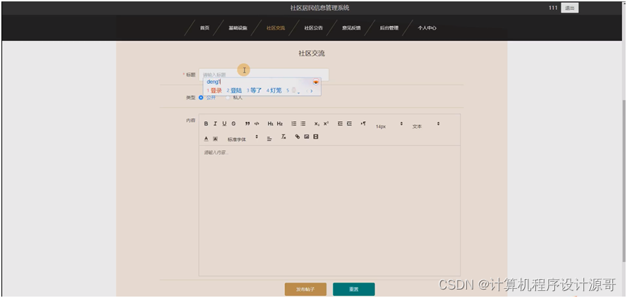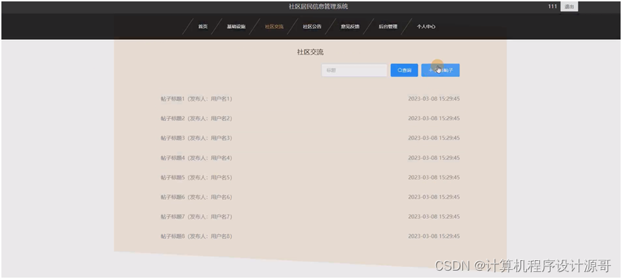 点击社区交流,进入社区交流页面,用户可以输入标题可以进行查询操作,进入查看交流信息和发布帖子。操作页面如下图所示: