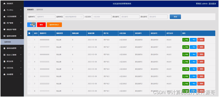 在缴费信息管理页面,进入楼栋资产管理页面,通过输入缴费单号、缴费类型、小区名称、居住楼号、居住放好可以查询相关信息,并进行新增、统计、详情、修改或删除操作。如图5-14所示: