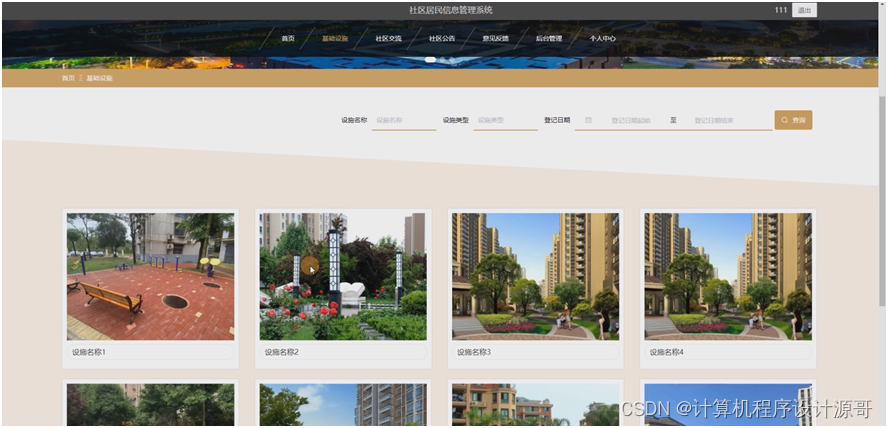 管理员点击基础设施管理,进入基础设施管理页面,通过输入设施名称、设施类型、登记日期可以查询相关信息,并对已有的基础设施进行修改、删除等操作。其页面如图5-15所示: