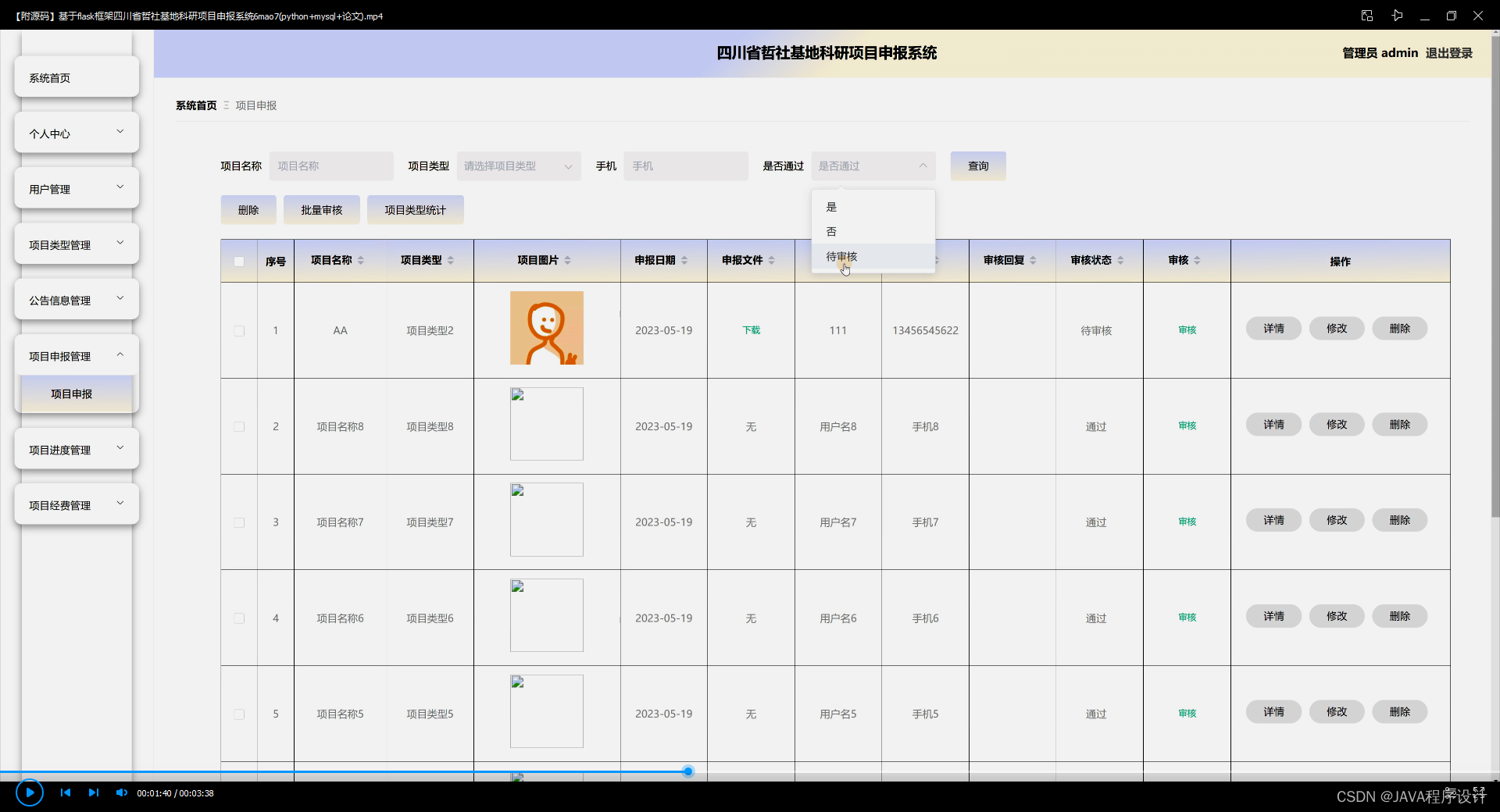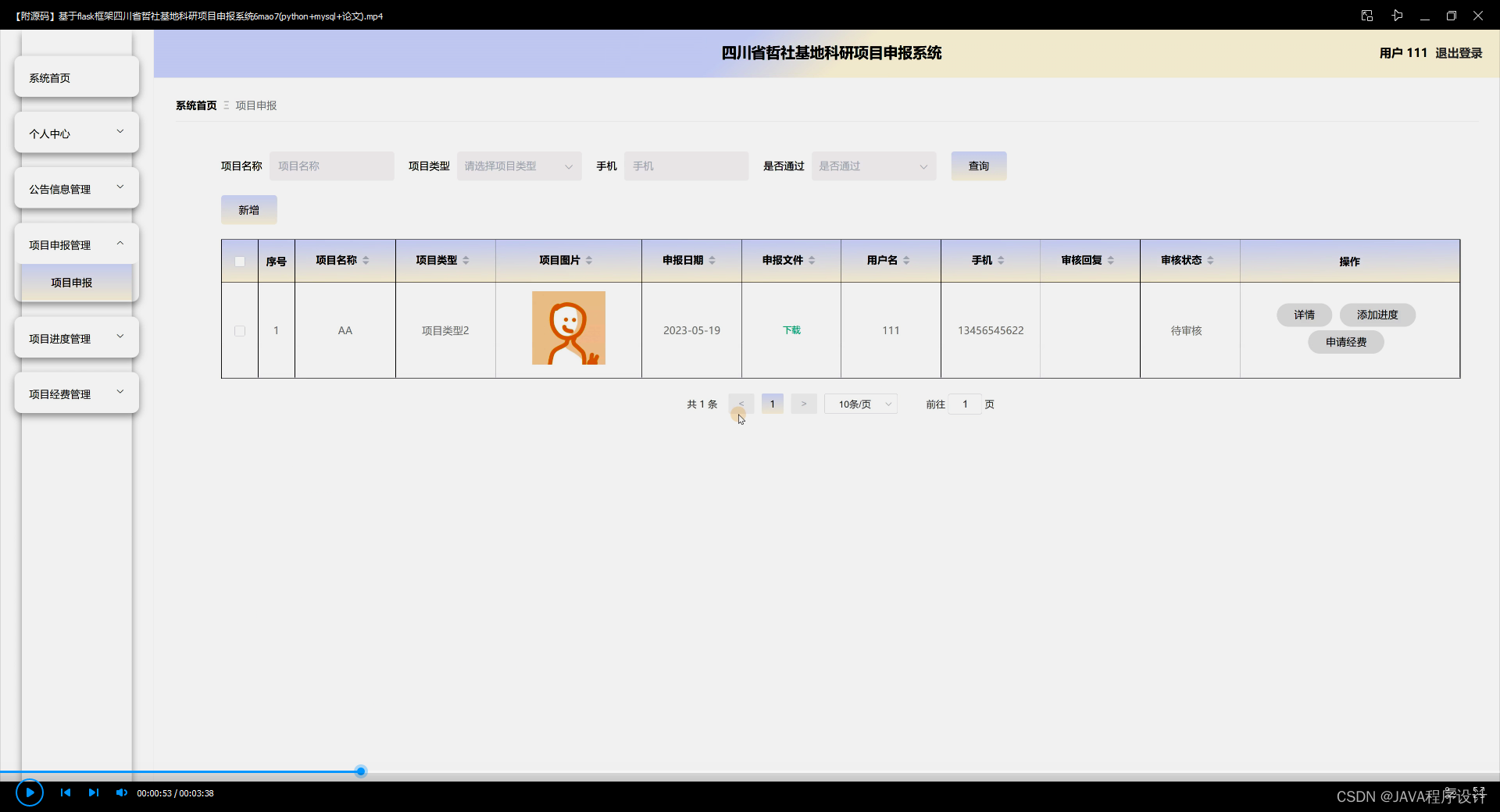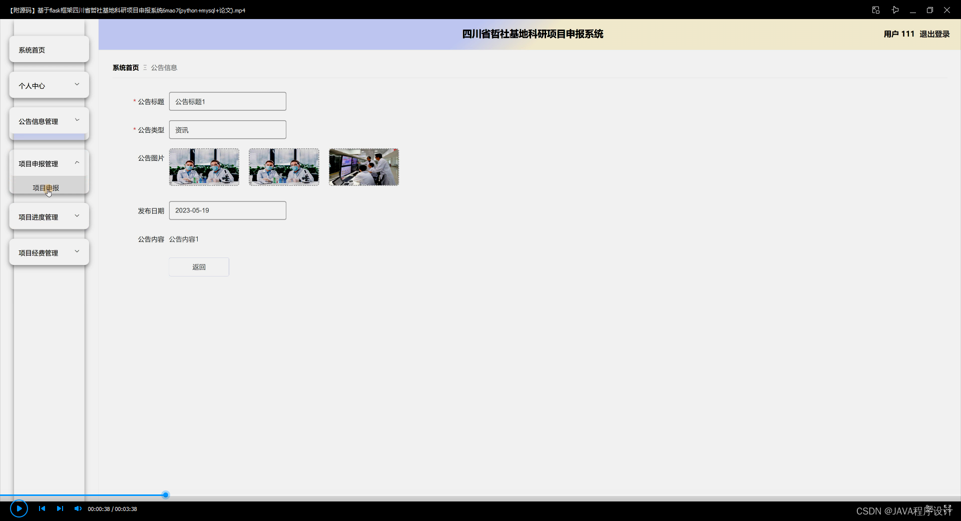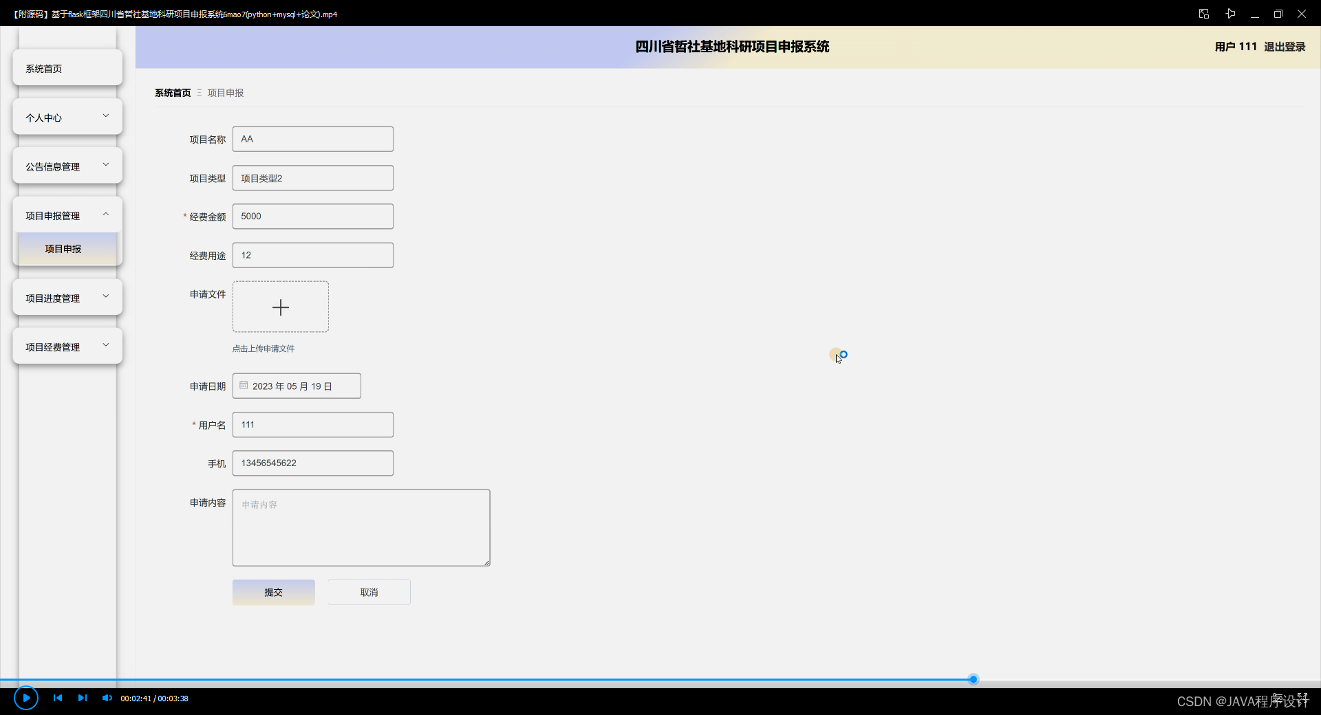 选题背景: 随着科技的不断发展,互联网技术在各个领域得到了广泛应用,特别是在教育、科研等领域。四川省哲社基地作为一个重要的科研机构,承担着众多科研项目的申报、管理和评审工作。传统的项目申报方式主要依赖于纸质材料和人工操作,不仅效率低下,而且容易出现信息错漏、丢失等问题。为了提高项目申报的效率和准确性,降低人力成本,有必要开发一套科研项目申报系统。本毕业设计题目旨在通过运用前端技术(HTML+CSS+JavaScript+Vue)和后端技术(Python+Flask)以及MySQL数据库,为四川省哲社基地打造一个高效、便捷的科研项目申报系统。