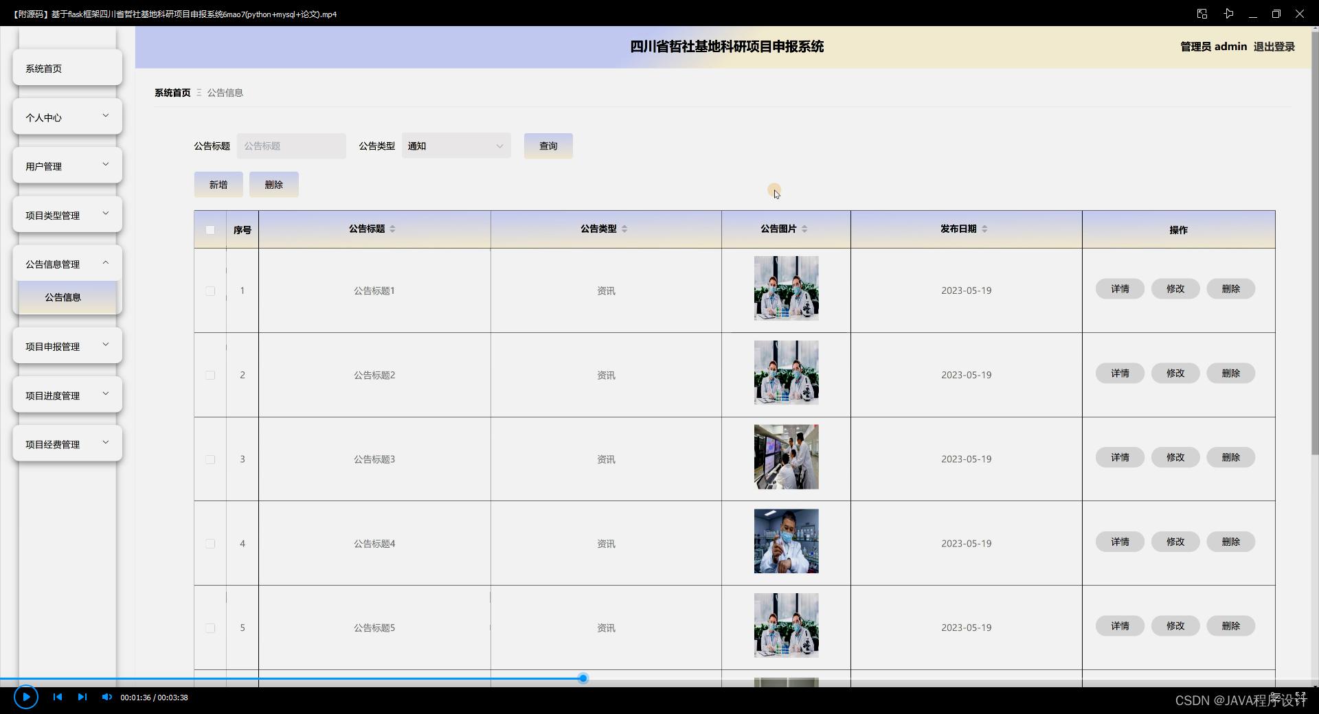 选题意义: 开发四川省哲社基地科研项目申报系统具有重要的现实意义。首先,该系统能够提高项目申报的效率。通过在线提交和审核申报材料,减少了纸质材料的使用,节省了资源,同时也避免了因人为因素导致的错误。其次,该系统有助于提高项目管理的水平。项目申报系统可以实现对项目的全程跟踪管理,包括项目进度、资金使用情况等,有利于提高项目的管理水平。此外,该系统还可以为科研人员提供一个便捷的交流平台,促进科研人员之间的沟通与合作。总之,开发四川省哲社基地科研项目申报系统对于提高科研项目申报和管理的效率、促进科研工作的顺利开展具有重要意义。