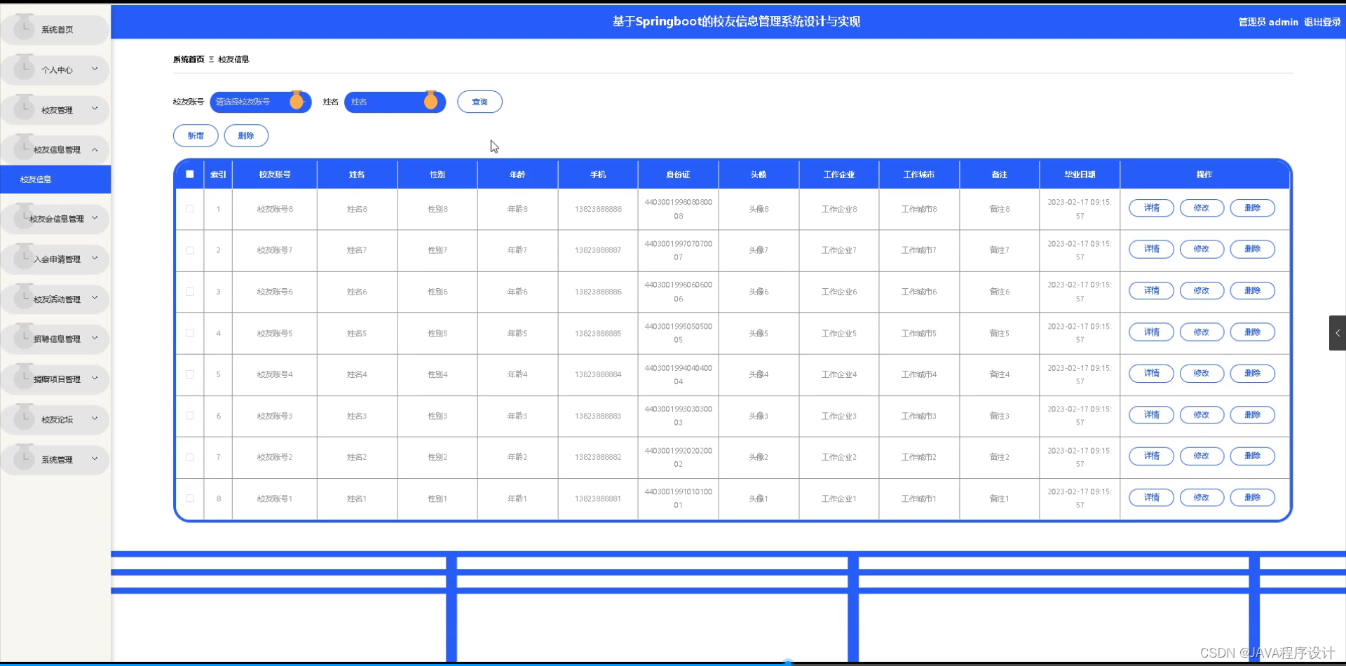 随着信息技术的飞速发展,各类信息系统在社会各个领域中发挥着越来越重要的作用。对于学校而言,校友是其重要的资源之一,他们的成就和影响力在很大程度上代表了学校的教育质量和声誉。因此,如何有效地管理和利用校友信息,成为了学校管理的一项重要任务。传统的校友信息管理方式主要依赖于人工,不仅效率低下,而且容易出错。因此,设计并实现一个校友信息管理系统,利用现代信息技术手段对校友信息进行有效管理,已经成为了当前学校管理工作的迫切需求。
