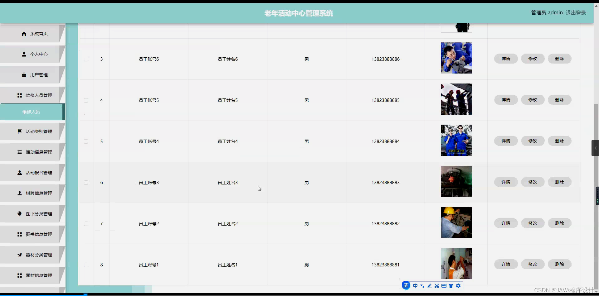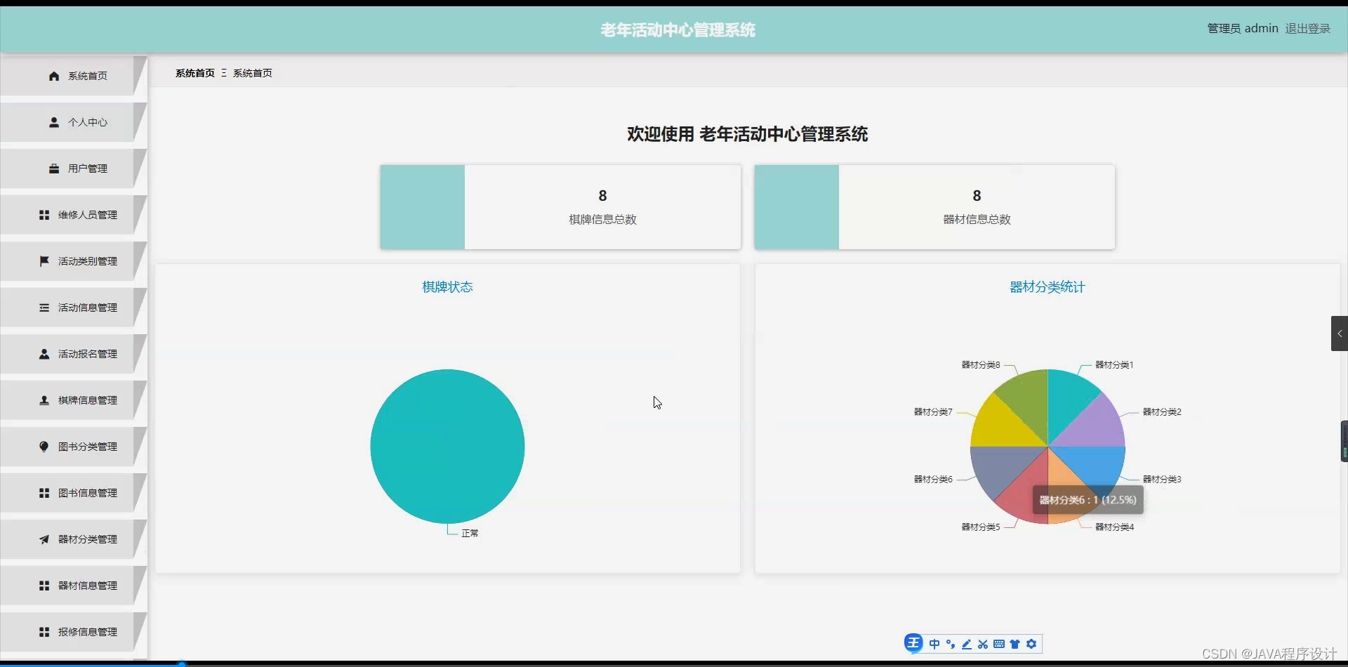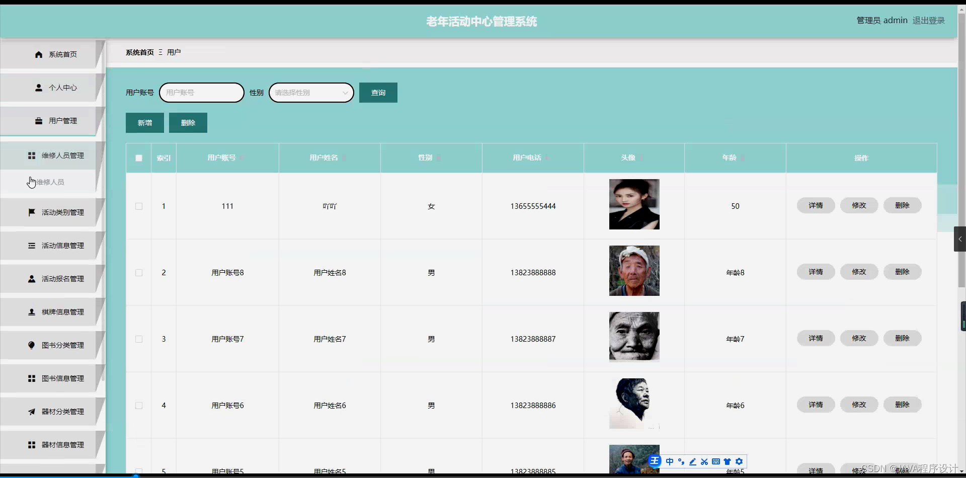 选题背景: 随着社会的发展和人口老龄化的加剧,老年人口数量逐年增加。为了满足老年人的生活需求和社交活动,老年活动中心应运而生。然而,传统的老年活动中心管理方式存在诸多不便,如信息不透明、活动组织效率低下、资源配置不合理等问题。为了解决这些问题,提高老年活动中心的管理水平和服务质量,开发一套老年活动中心管理系统显得尤为重要。该系统将利用现代信息技术手段,实现对老年活动中心各项资源的高效管理,为老年人提供更加便捷、舒适的活动环境。