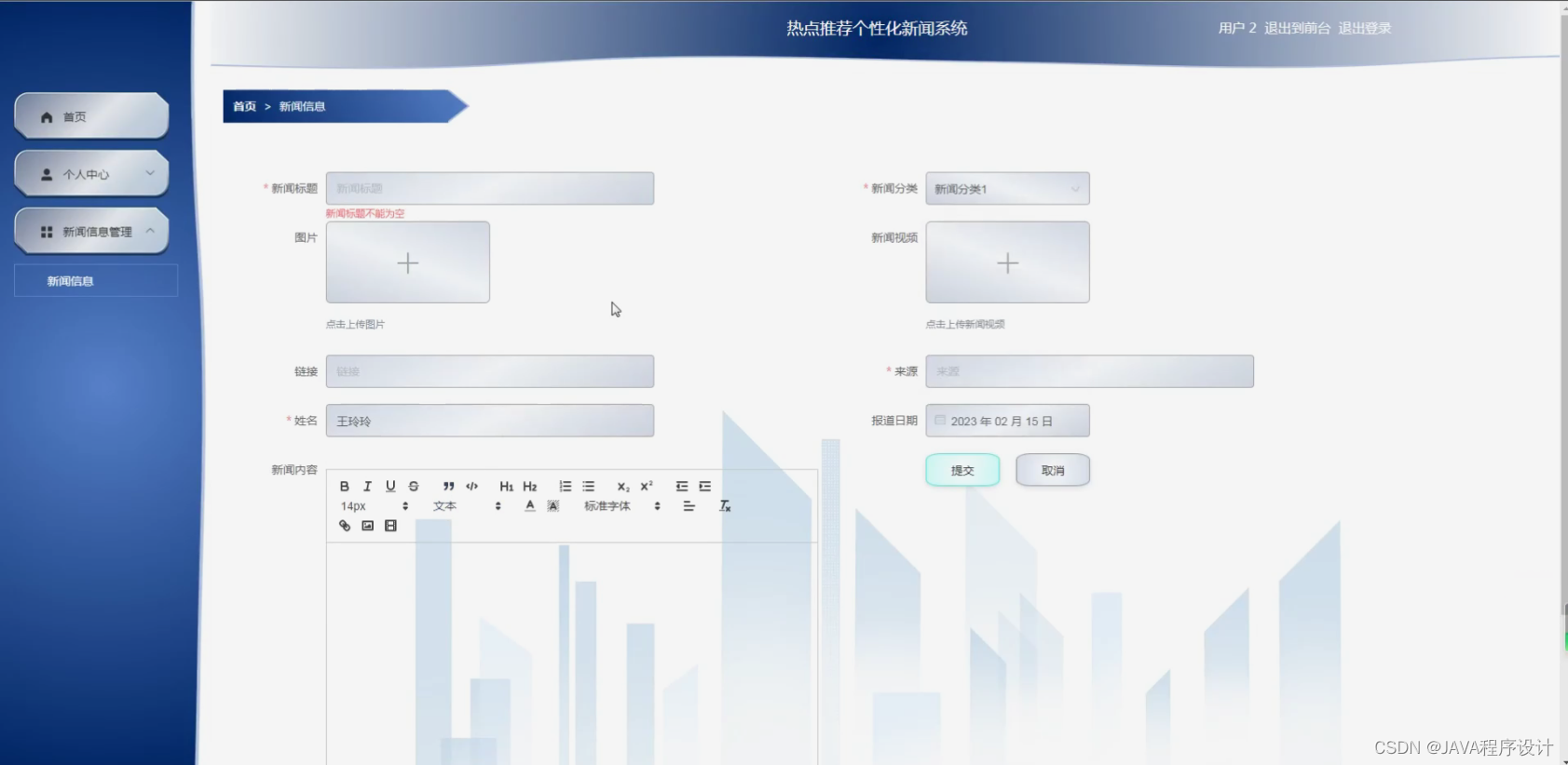 随着个性化服务的需求日益增长,一个能够根据用户个性化需求推荐新闻的系统显得尤为重要。个性化新闻推荐系统能够帮助用户节省筛选信息的时间,直接获取到他们感兴趣的新闻,从而极大提升用户体验。对于新闻平台而言,个性化推荐不仅能够吸引和保留用户,还能够帮助平台更好地了解用户需求,进而优化内容发布策略,提高内容的针对性和吸引力。此外,个性化推荐系统的研究与开发,对于推动相关技术的发展也具有重要意义。它涉及到用户数据的采集、处理和分析,需要运用现代Web技术来实现复杂的功能,这对于技术人员来说是一个挑战,也是一个学习和成长的机会。通过实际开发这样一个系统,可以深入理解前后端交互、数据处理、用户体验设计等多个方面的知识,为未来的职业生涯打下坚实的基础。