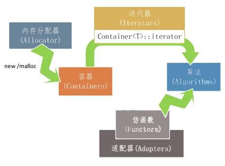 容器通过内存分配器分配空间;容器和算法因为迭代器而分离,算法通过迭代器访问容器;仿函数协助算法指定不同的策略;适配器套接仿函数。