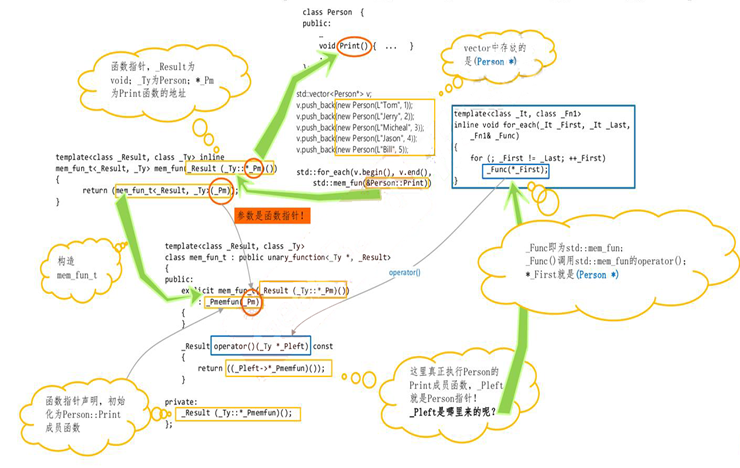 其中的mem_fun(&Person::print) 就是生成了一个具有单参的、针对Person类、内部调用Person::Print的全局函数。我们同样根据一个图来看这个工具的实现: