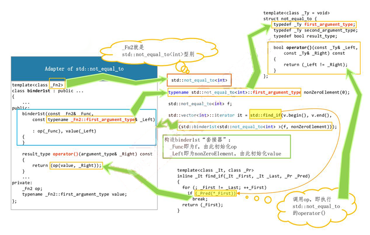然而,not_equal_to()(const T& a,const T&b),并不能接受一个参数;find_if()又是向最后一个函数对象直接给予一个引用作为参数,所以无法编译通过。为此使用binder1st来把其中的一个参数固定下来。 从下图可以了解到一些实现细节: