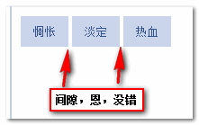 <div class="space"> <a href="##"> 惆怅</a><a href="##"> 淡定</a><a href="##"> 热血</a> </div> 或者是: <div class="space"> <a href="##">惆怅</a ><a href="##">淡定</a ><a href="##">热血</a> </div>
