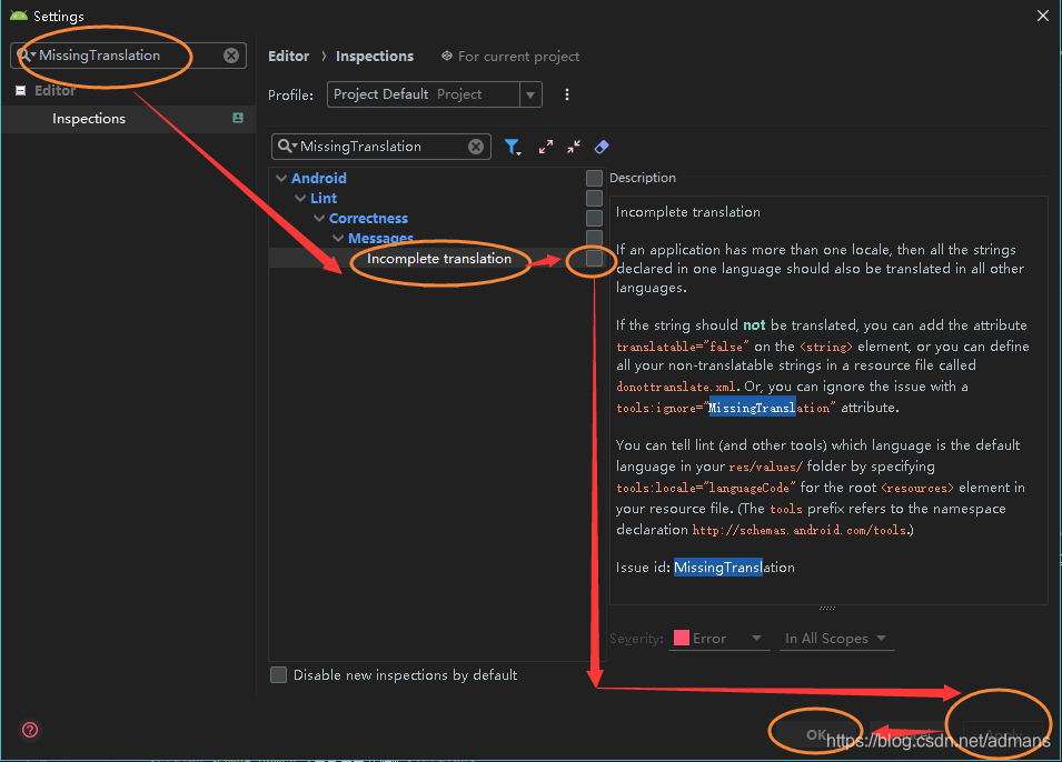 首先引起提示的原因是因为Lint 代码检查工具发现你的项目中(或者引用的三方库)有部分string.xml文件内容做了国际化操作,但却不完整,有些文本内容并没有相应的国际化翻译,在android开发中常见于项目引用的Libraries第三方库中有做了国际化翻译的(例如知名的Android-PullToRefresh下拉刷新项目,它做了十几种语言的翻译)和引用第三方SDK资源时候(例如我们分享常用的ShareSDK,它提供了中文和英文语言的string.xml),当我们的项目中包含这些内容的时候,就可能被lint tool提示错误。
