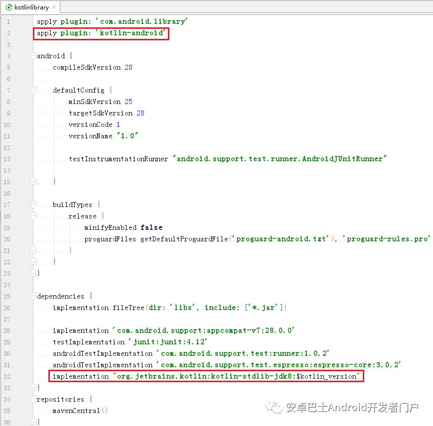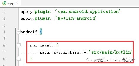 3.在项目module的 `build.gradle` 的顶部添加以下代码:applyplugin: 'kotlin-android'