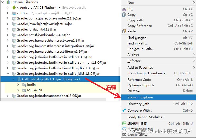 右键选择 Show in Explorer,就可以看到kotlin的jar包和资源下载在本地的路径了。