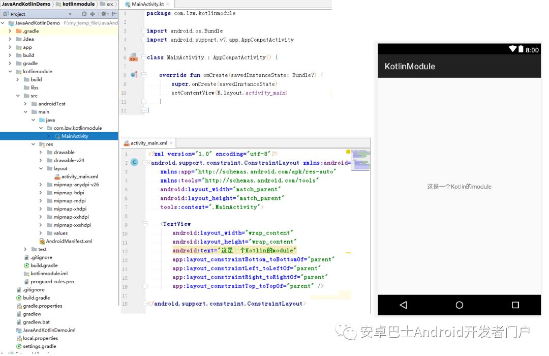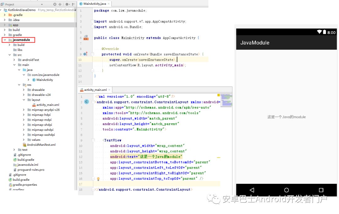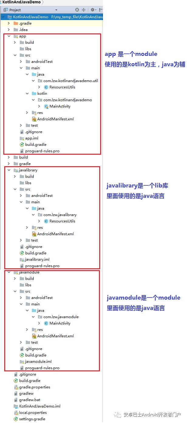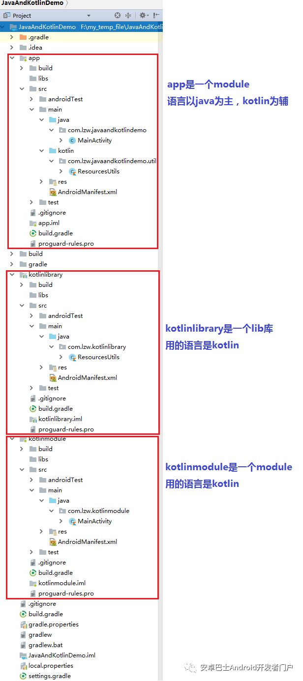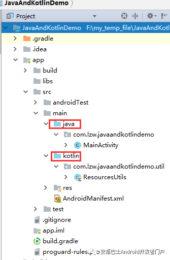 我们还是拿第一个前面的工程KotlinAndJavaDemo为例,我在moduleapp里面同时使用kotlin和java两种语言做开发。 为了便于区分,需要在该module的build.gradle文件做配置。