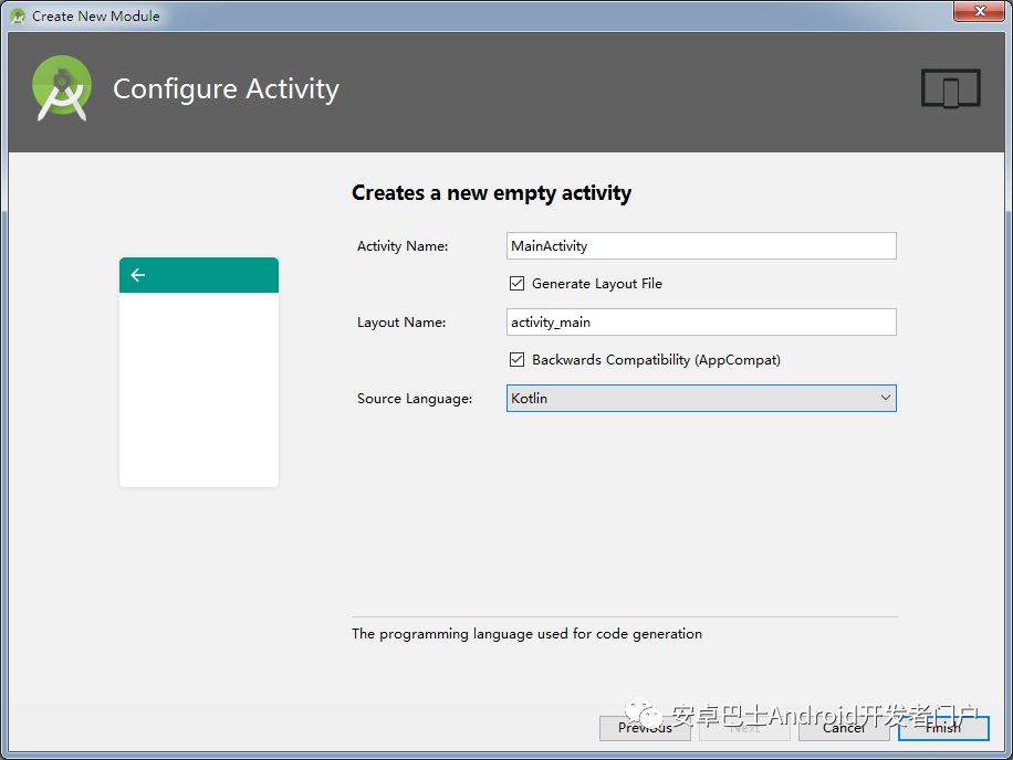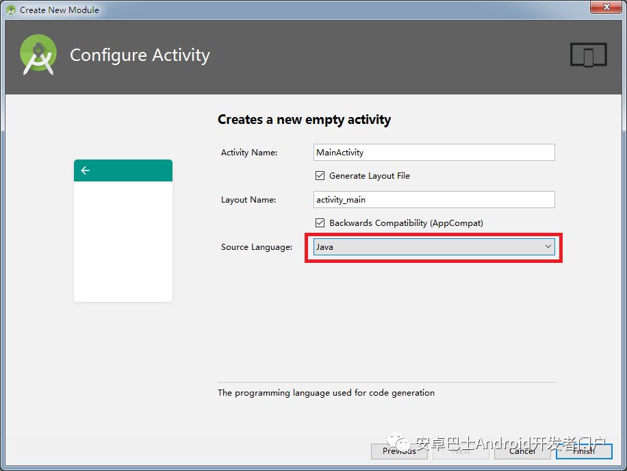 (1)创建一个名为 `KotlinAndJavaDemo` 的项目创建一个module,取名为`JavaModule`,跟普通创建一样,只是最后一步要选择使用的语言是`Java`,如图所示: