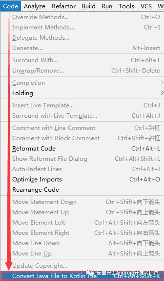 - 1.选中Java文件,点击菜单栏Code-->Convert Java File to Kotlin File ,即可把java文件转换成kotlin文件。