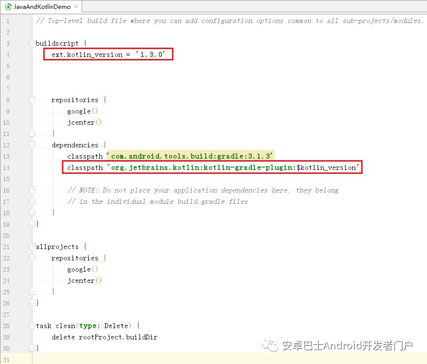2.在工程根目录 `build.gradle` 的`build`节点 配置kotlin版本号:build {