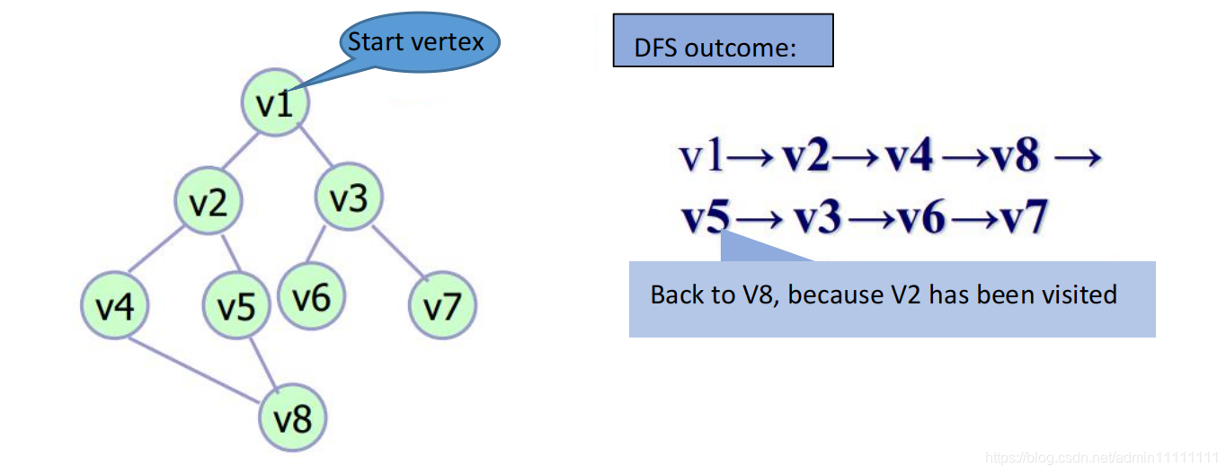 We start from vertex v1, and the next vertex is v2, keep going forward then we will go through v4 and arrived at v8, but v8 also has a path to v5, so keep visiting v5.