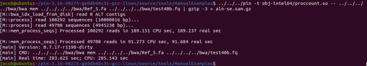 因为pin 和proccount.so文件是在pin的相关目录下,因此需要进入对应的目录下,同时因为bwa是在bwa的相关目录下,因此也需要找到对应目录下的文件。执行以下命令: