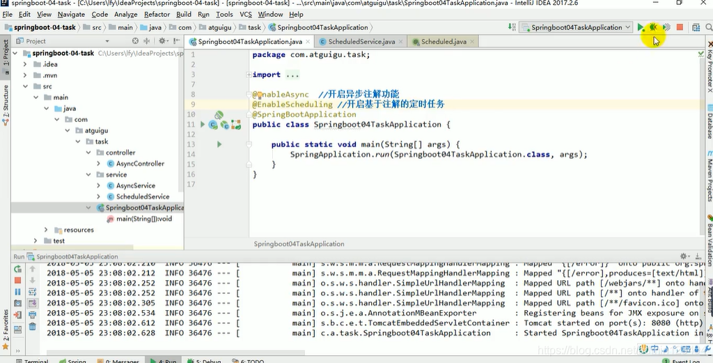 之后在启动类上加上@EnableScheduling注解,启动定时任务。