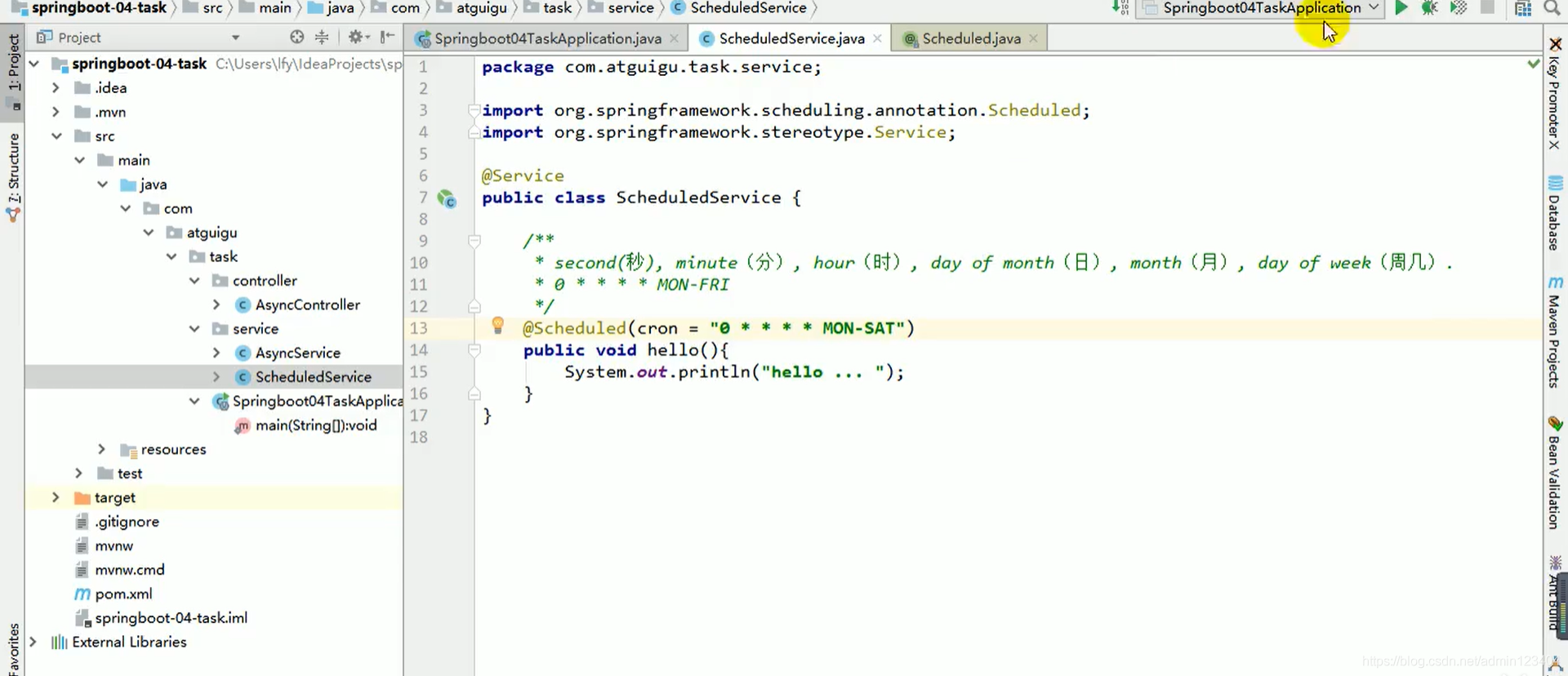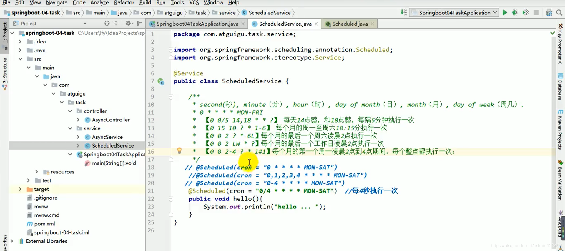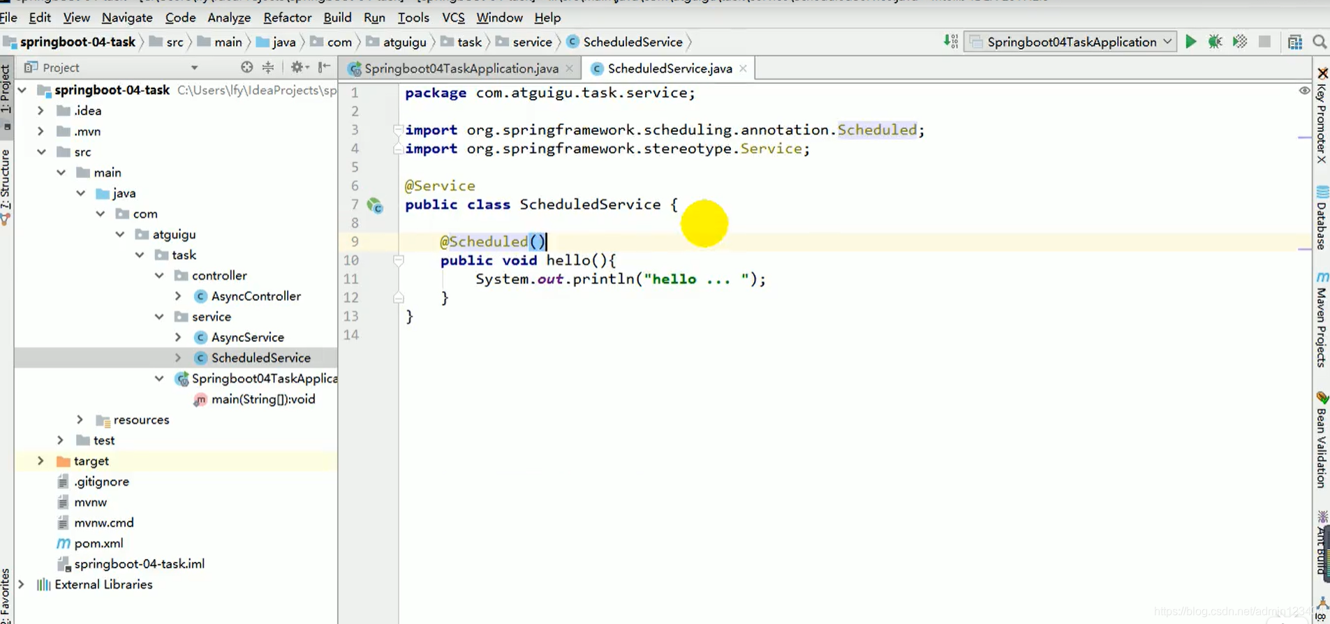 首先创建一个service类,创建一个hello方法,并在方法上加上@Scheduled 注解