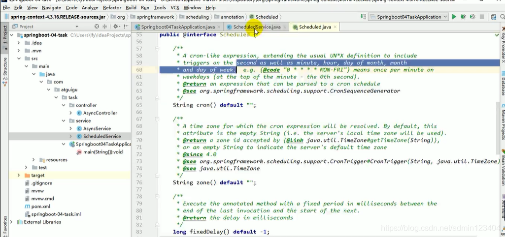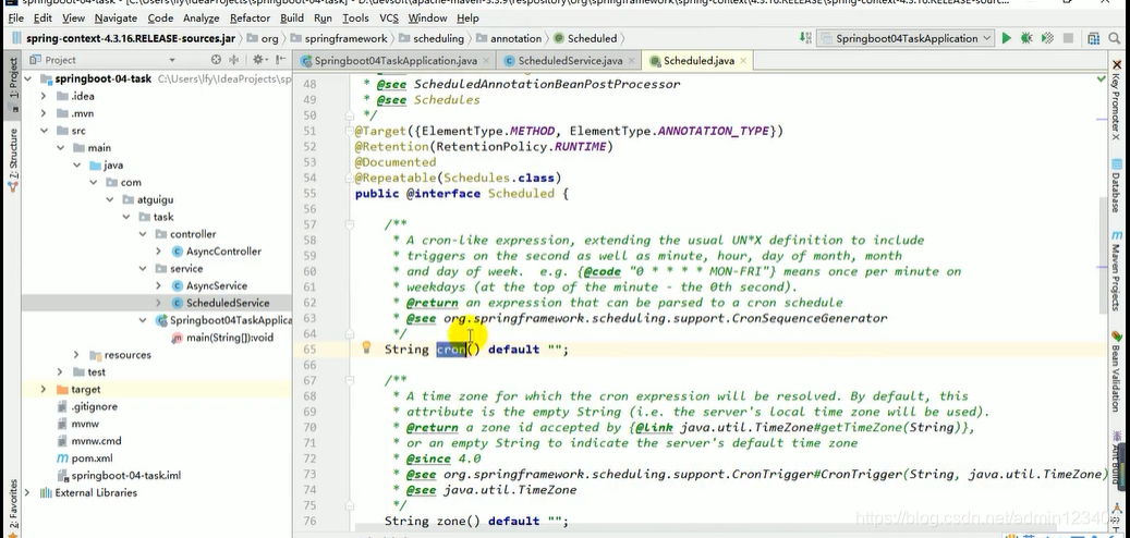 @Scheduled 点进去 ,里面有很多属性,最重要的就是cron属性。它来指定定时任务的表达式。
