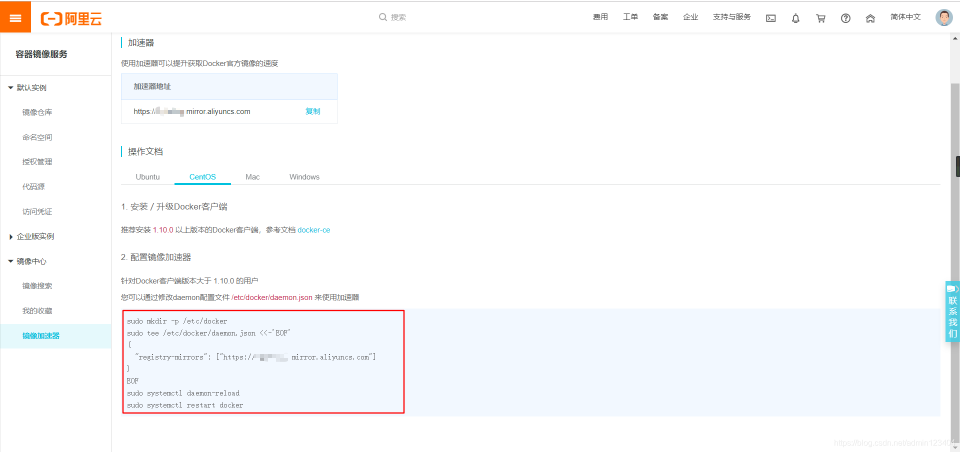 把上面红色框的内容复制粘贴到Linux控制台上面,完成替换Docker默认仓库的替换。