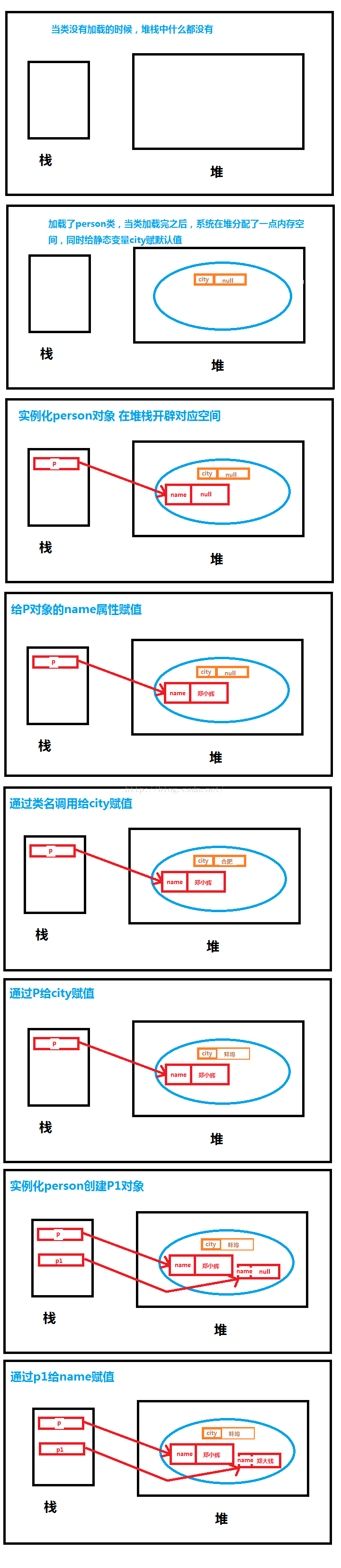 package object; public class Person { //定义一个静态的变量 public static String city; //定义一个非静态的变量 public String name; public static void main(String[] args) { /*当person类加载的时候,静态变量就已经存在了,在堆内存中*/ //实例化person对象 在堆内存中创建一个person对象 //里面有一个属性name = null; //在栈内存中有一个p指向这个对象 Person p = new Person(); //给name属性赋值 p.name="郑小辉"; //通过类名给city赋值 Person.city="合肥"; //通过对象给city赋值 p.city="蚌埠"; //创建一个新的person对象 Person p1 = new Person(); //给name赋值 p1.name="郑大钱"; } }