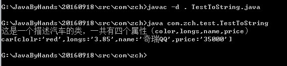 package com.zch.test; /* toString方法以及重写toString方法 toString方法是一个自我描述方法 方法本身返回的是该对象的实现类的 类名 + @ + hashCode 的值 可以通过重写toString方法来自定义自我描述 */ //定义一个类:汽车类 class Car { //定义汽车的属性 private String color; //颜色 private String longs; //长度 private String name; //名称 private String price; //价格 //带参构造函数 public Car (String color,String longs,String name,String price) { this.color = color; this.longs = longs; this.name = name; this.price = price; } //get/set方法 public void setColor(String color) { this.color = color; } public String getColor() { return color; } public void setLongs(String longs){ this.longs = longs; } public String getLongs(){ return longs; } public void setName(String name){ this.name = name; } public String getName(){ return name; } public void setPrice(String price){ this.price = price; } public String getPrice(){ return price; } //重写toString方法 public String toString(){ return "这是一个描述汽车的类,一共有四个属性(color,longs,name,price)" + "\n" + "car[clolr:'"+color+"',longs:'"+longs+"',name:'"+name+"',price:'"+price+"']"; } } //主函数 public class TestToString { public static void main(String[] args){ //创建一个汽车对象 Car car = new Car("red","3.85","奇瑞QQ","35000"); //调用toString方法 System.out.println(car.toString()); } }