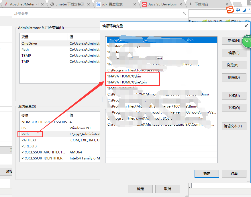 2、在Path中添加;%JAVA_HOME%\bin;%JAVA_HOME%\jre\bin