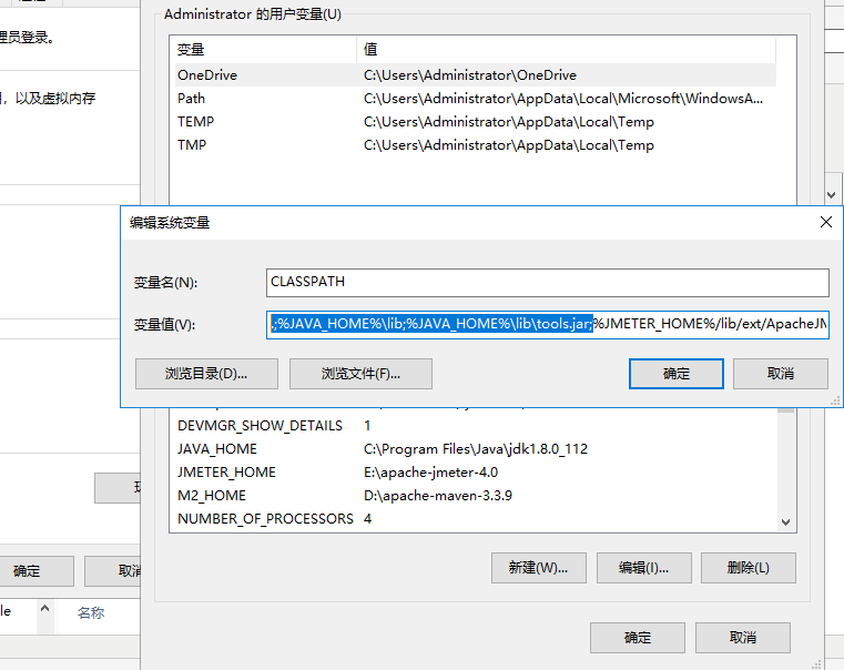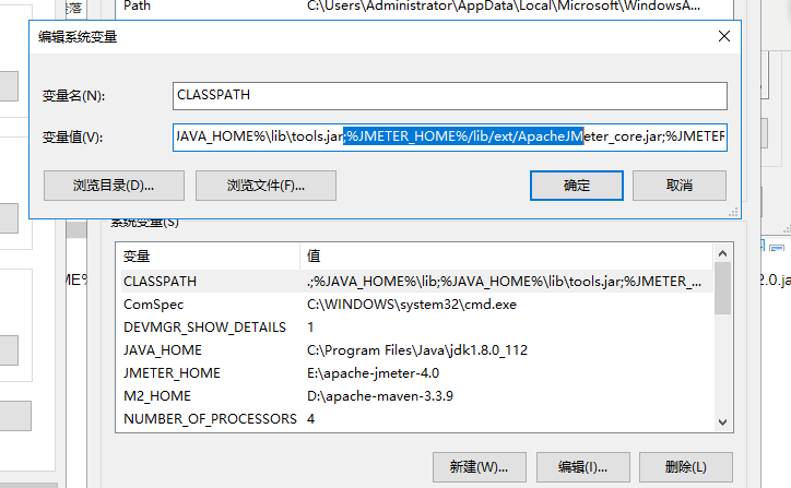b、配置CLASSPATH,追加 上;%JMETER_HOME%/lib/ext/ApacheJMeter_core.jar;%JMETER_HOME%/lib/jorphan.jar;%JMETER_HOME%/lib/logkit-2.0.jar