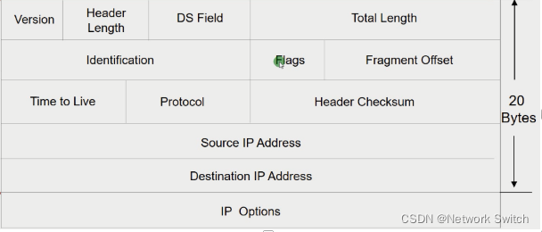 第十个字段Header Checksum(报头校验核)通过散列算法CRC对IP报头的头部字段做一个校验,把散列的算法值放到这个字段。接收方收到数据包之后会对整个三层报头在做一个校验得出一个乱码对比这个报头校验核得出的新的乱码看是否一致,一致就代表数据包的三层报头是没有被篡改的。