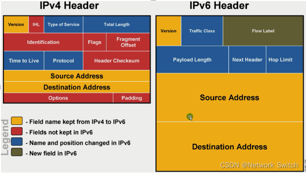 红色代表IPV4中表在IPV6中没有的字段。IPV6中报头是定长的40Bit。IPV6没有标识符,标记和分断偏移量,指IPV6不建议做三层的数据切片,有两点好处:一是减少路径中CPU的消耗并且增加端到端的效率。