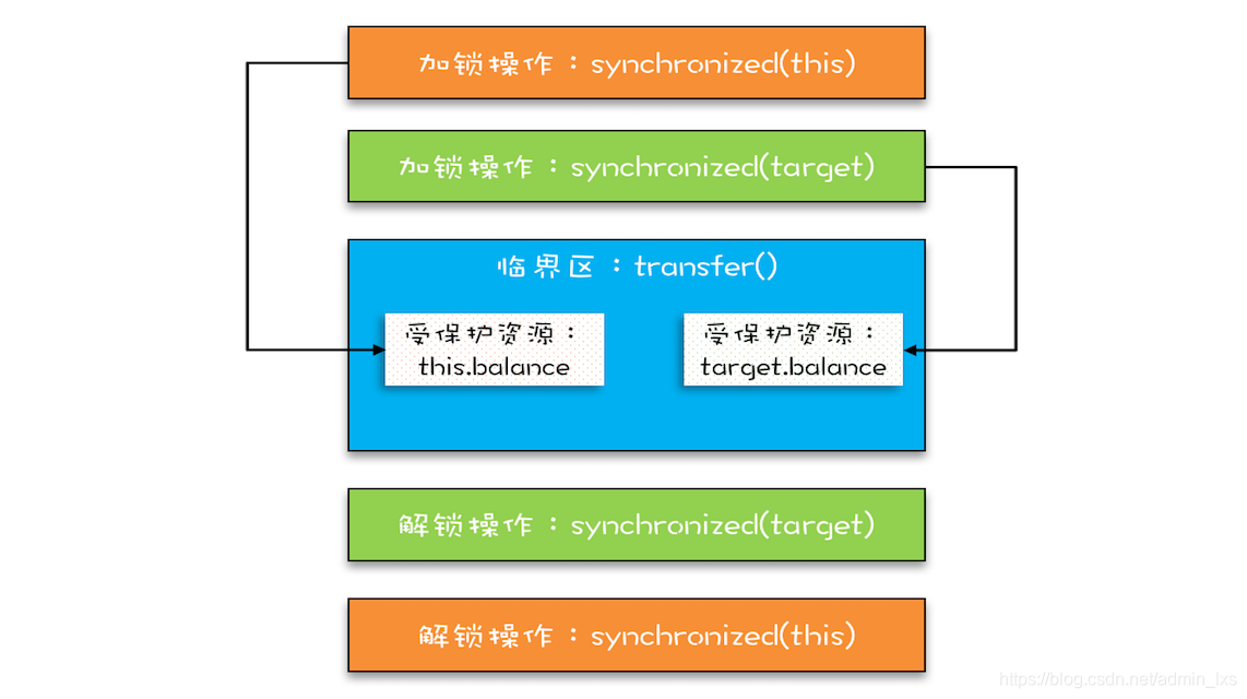 破坏这个条件,需要对资源进行排序,然后按序申请资源。这个实现非常简单,我们假设每个账户都有不同的属性Id,这个Id可以作为排序字段,申请的时候,我们可以按照从小到大的顺序来申请。比如下面代码,①~⑥处的代码对转出账户(this)和转入账户(target)排序,然后按照序号从小到大的顺序锁定账户。这样就不存在“循环”等待了。