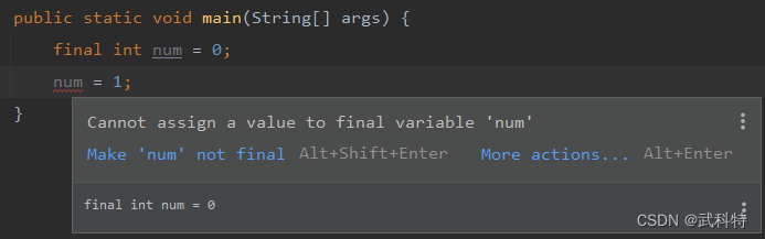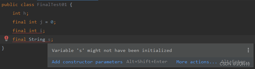 3.修饰类的成员变量,则必须当场赋值,否则编译会报错