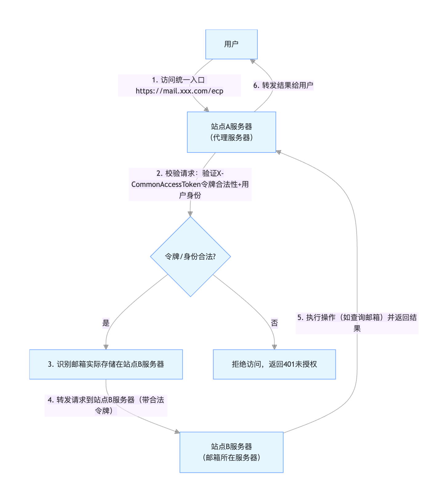 其实就是服务器之间自动转发用户请求的机制,比如用户访问 A 站点的 OWA/ECP/EWS 接口,但邮箱数据实际存储在 B 站点的服务器上,此时 A 站点会作为 “代理服务器”,将请求转发到 B 站点,再把 B 站点的响应返回给用户,用户无需手动切换访问地址。