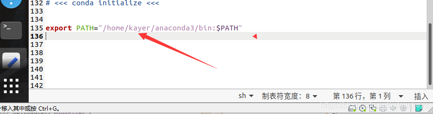 在终端中输入指令,打开文件,并在最后一行添加默认安装路径
