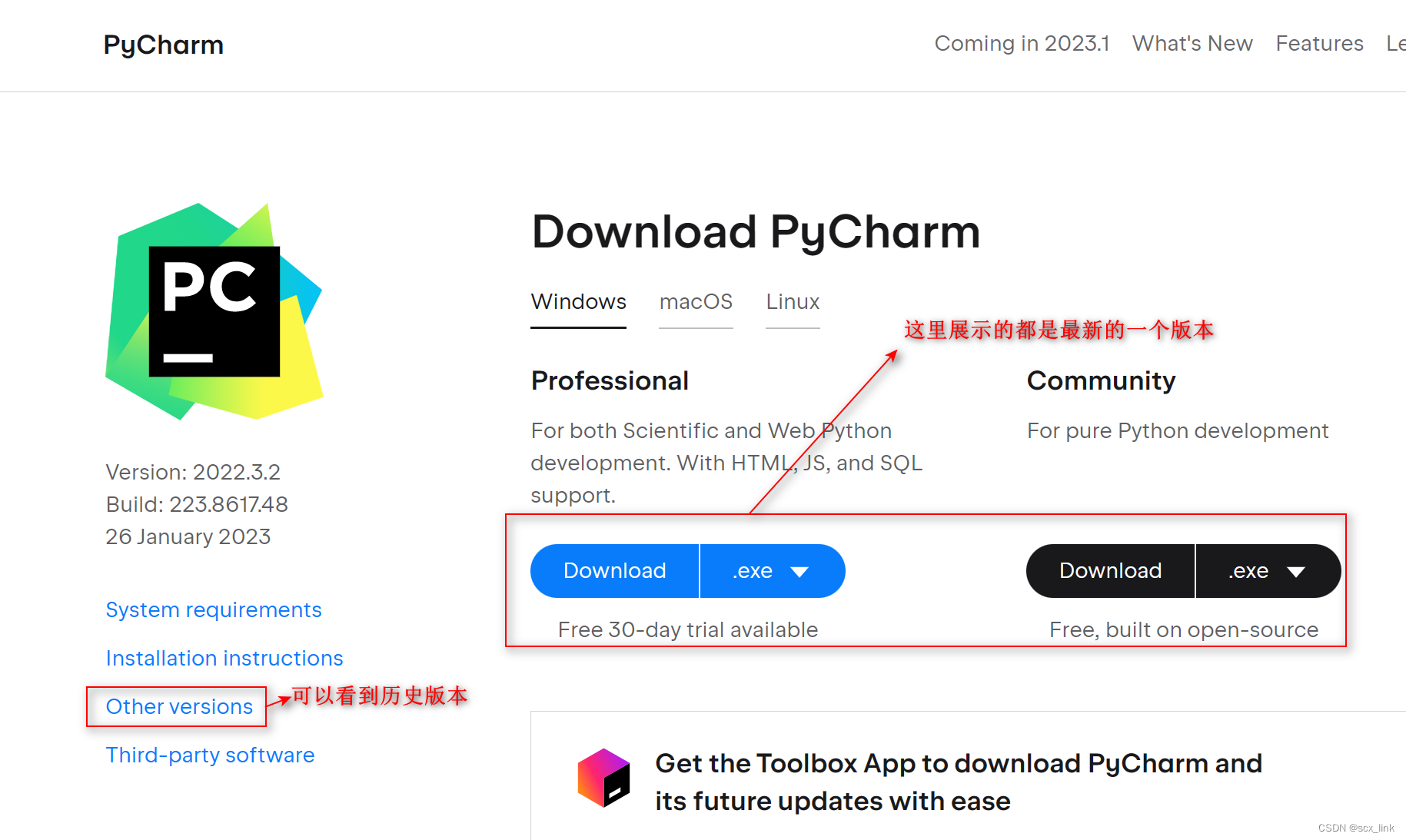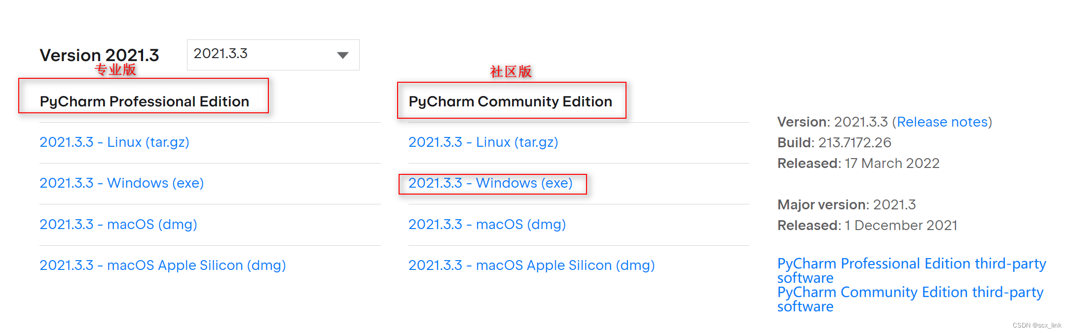 可以看到 PyCharm 有 2 个版本,分别是 Professional(专业版)和 Community(社区版)。其中,专业版是收费的,可以免费试用 30 天;而社区版是完全免费的。