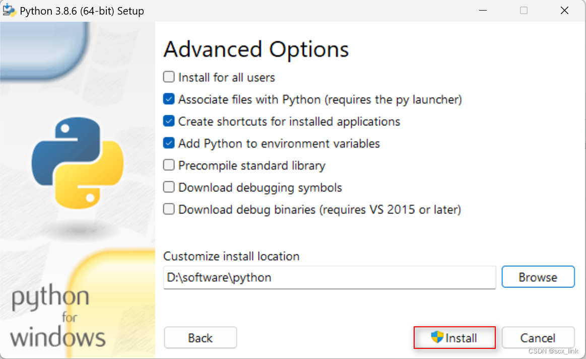 指定安装目录位置,其他保持默认,点击Install