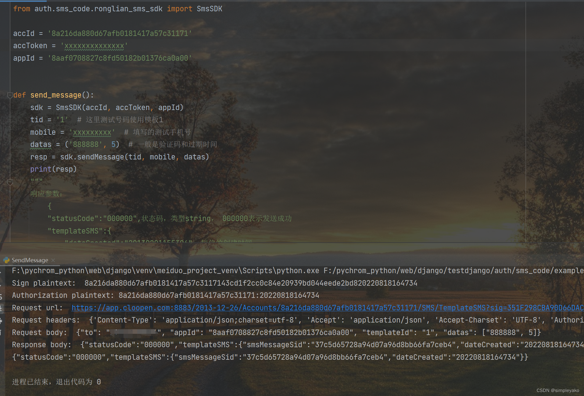 本文详细介绍了如何在Django项目中集成云通讯服务,包括注册登录、创建应用、获取appid、配置测试号码、下载SDK、编写并测试短信验证码发送功能。示例代码展示了发送验证码的格式,并提供了后续实现前后端逻辑代码的预告。